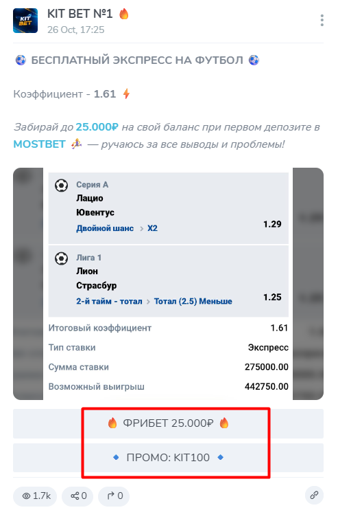 Основатель выкладывает их в виде скриншота ставки, где указана информация о событии и его коэффициент. Обычно у бесплатной аналитики на данном проекте котировки меньше 2. Например, выше каппер предоставляет экспресс с коэффициентом 1.61. С бесплатным прогнозом или экспрессом основатель не оставляет подробный анализ матчей. В целом он не комментирует события и ставку. Но зато в записях всегда имеются ссылки букмекерской конторы и промокод, дающий бонусы. Для получения 25 000 бонусных рублей пользователям нужно зарегистрироваться по ссылке и активировать промокод с канала.