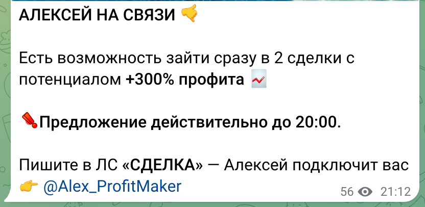Если вы стали жертвой @Alex_ProfitMaker, то оставьте отзыв о канале. Вы также можете отправить жалобу на нашем сайте, чтобы другие пользователи тоже были предупреждены.